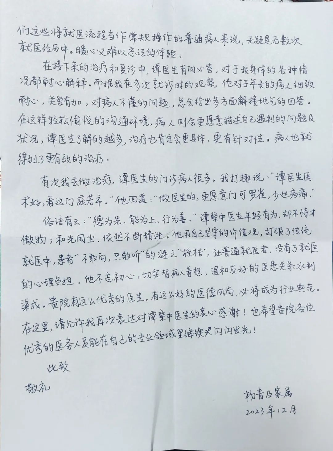對(duì)于譚醫(yī)生來(lái)說(shuō),這是一件小事,但對(duì)于楊女士來(lái)說(shuō),無(wú)疑是無(wú)數(shù)次就醫(yī)經(jīng)歷中暖心又難以忘記的體驗(yàn),楊女士于2023年12月28日將錦旗送到了譚醫(yī)生的手中,并親手將表?yè)P(yáng)信送到了醫(yī)院辦公室,與楊女士溝通后烏魯木齊金天川醫(yī)院領(lǐng)導(dǎo)班子高度重視、積極籌備,為此次受到患者表?yè)P(yáng)的骨傷科醫(yī)師們頒發(fā)了紅包,以資鼓勵(lì);對(duì)他們“以患者為中心”的服務(wù)理念提出表?yè)P(yáng),周少云院長(zhǎng)希望受表獎(jiǎng)的同事要不驕不躁、繼續(xù)努力,并且請(qǐng)全院醫(yī)護(hù)人員都能時(shí)刻做好優(yōu)質(zhì)服務(wù)并銘記:每一次患者的微笑、每一次患者的感謝,都是對(duì)我們工作的最高認(rèn)可。都是將患者放在第一位的回報(bào)。