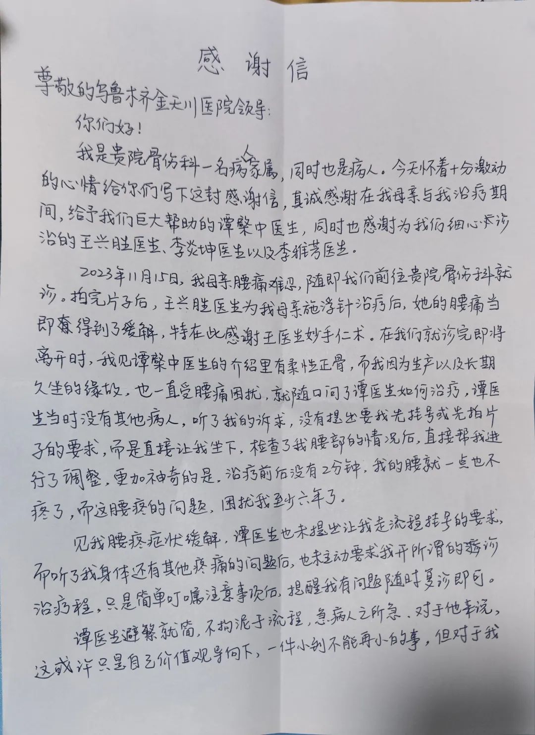2023年12月28日,一位患者將一面寫(xiě)有“精醫(yī)重道仁心仁術(shù),和光同塵與時(shí)舒卷”的錦旗和一封表?yè)P(yáng)信送到烏魯木齊金天川醫(yī)院,以此表達(dá)對(duì)金天川醫(yī)院骨傷科譚棨中醫(yī)生及王興盛醫(yī)生、李炎坤醫(yī)生、李雅芳醫(yī)生精湛醫(yī)術(shù)和貼心服務(wù)的感激之情。這面錦旗不僅是對(duì)骨傷科醫(yī)生們的個(gè)人褒獎(jiǎng),更是對(duì)烏魯木齊金天川醫(yī)院對(duì)患者的優(yōu)質(zhì)服務(wù)和診療質(zhì)量的肯定。