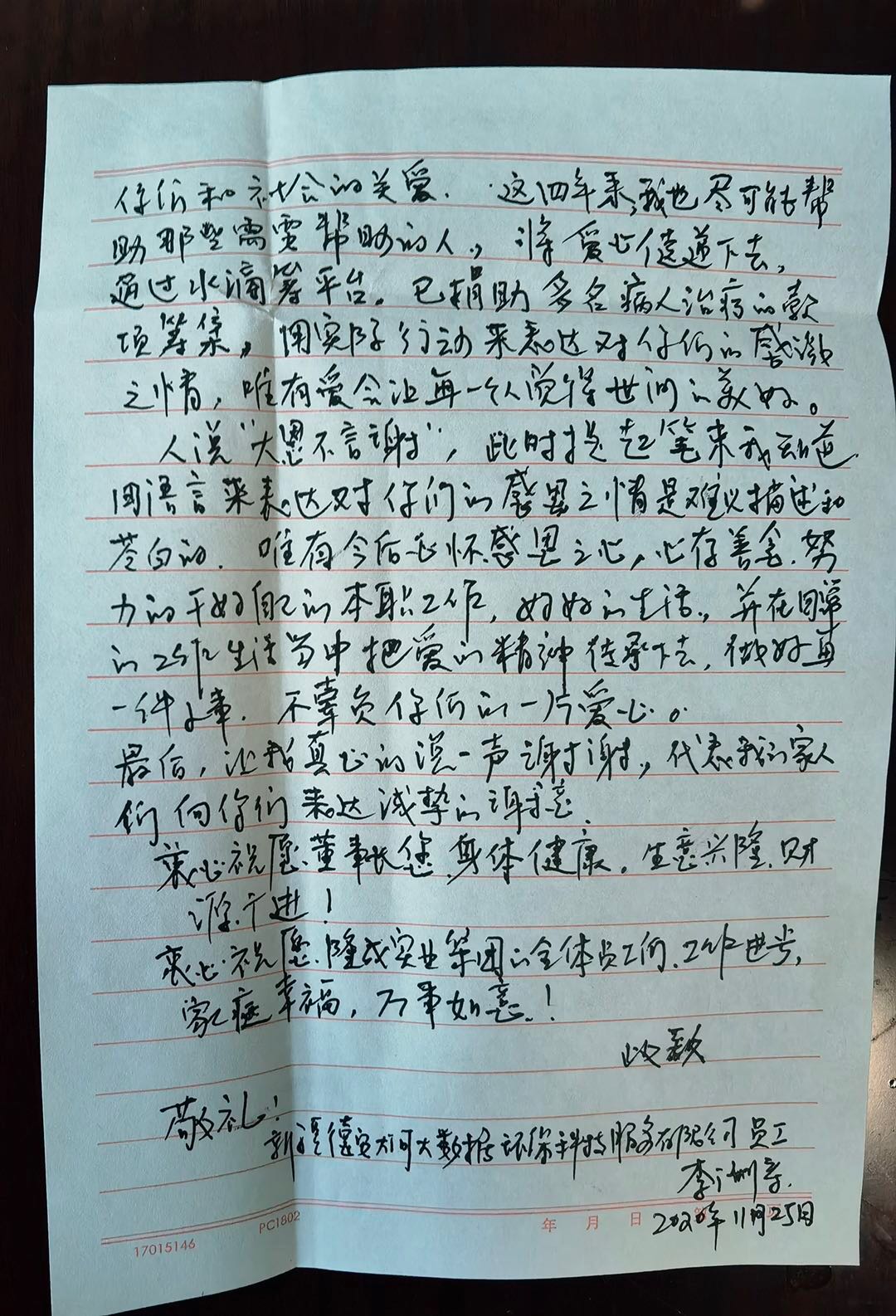 2020年11月27日,集團(tuán)公司接到一位來自“金雪馳愛心基金”幫扶者(新疆德安大河大數(shù)據(jù)環(huán)??萍挤?wù)有限公司員工)李先生的登門答謝。