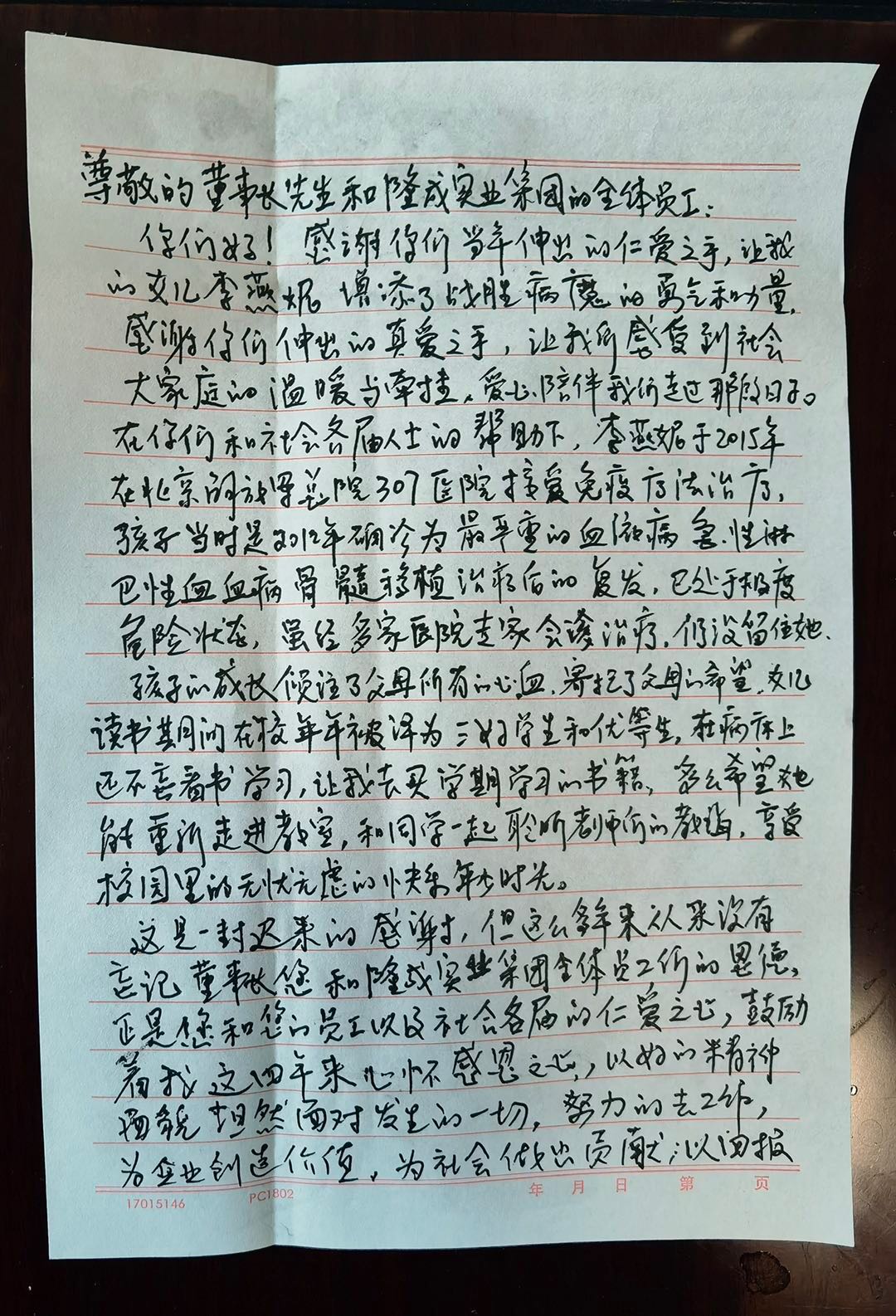 事由:金雪馳愛心基金于2012年援助了李先生,李先生女兒在2012年被確診為白血病,曾接受骨髓移植后又復(fù)發(fā),2015年在北京解放軍總院接受治療時已處于極度危險狀態(tài),隨后經(jīng)過多家醫(yī)院的專家會診治療,最終還是沒能將孩子的生命挽救回來,當(dāng)年在求醫(yī)路上接受到“金雪馳愛心基金”的捐助,一直對董事長劉輝先生和隆成實(shí)業(yè)的全體員工存有感恩之心,今日登門拜訪,并送上感謝信和答謝禮。董事長親切的接待了李先生也回贈于他金雪馳紀(jì)念品,董事長對李先生女兒的遭遇表示不幸,并表示了隆成集團(tuán)對他的幫助是我們做企業(yè)人的社會責(zé)任,也希望“金雪馳愛心基金”今后能夠幫助到更多的人和事。